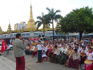ရန္ကုန္ ၿမိဳ႕ေတာ္ခန္းမေရွ႕ လြတ္လပ္ေရး ေက်ာက္တုိင္ ကြင္းတြင္ ျပဳလုပ္ေသာ NDF ပါတီ ကုိယ္စားျပဳ လႊတ္ေတာ္ ကိုယ္စားလွယ္ ေလာင္းမ်ား၏ လူထုေဟာေျပာပြဲ တခု(ဓာတ္ပံု – NDF Facebook)